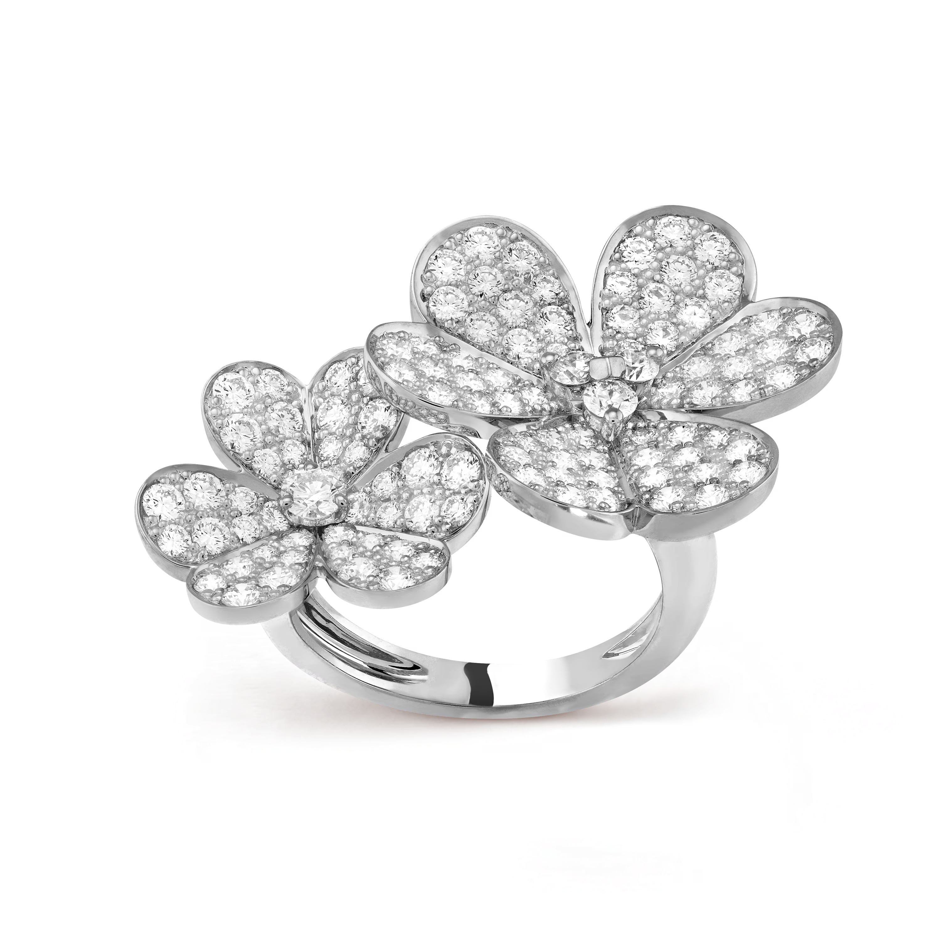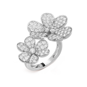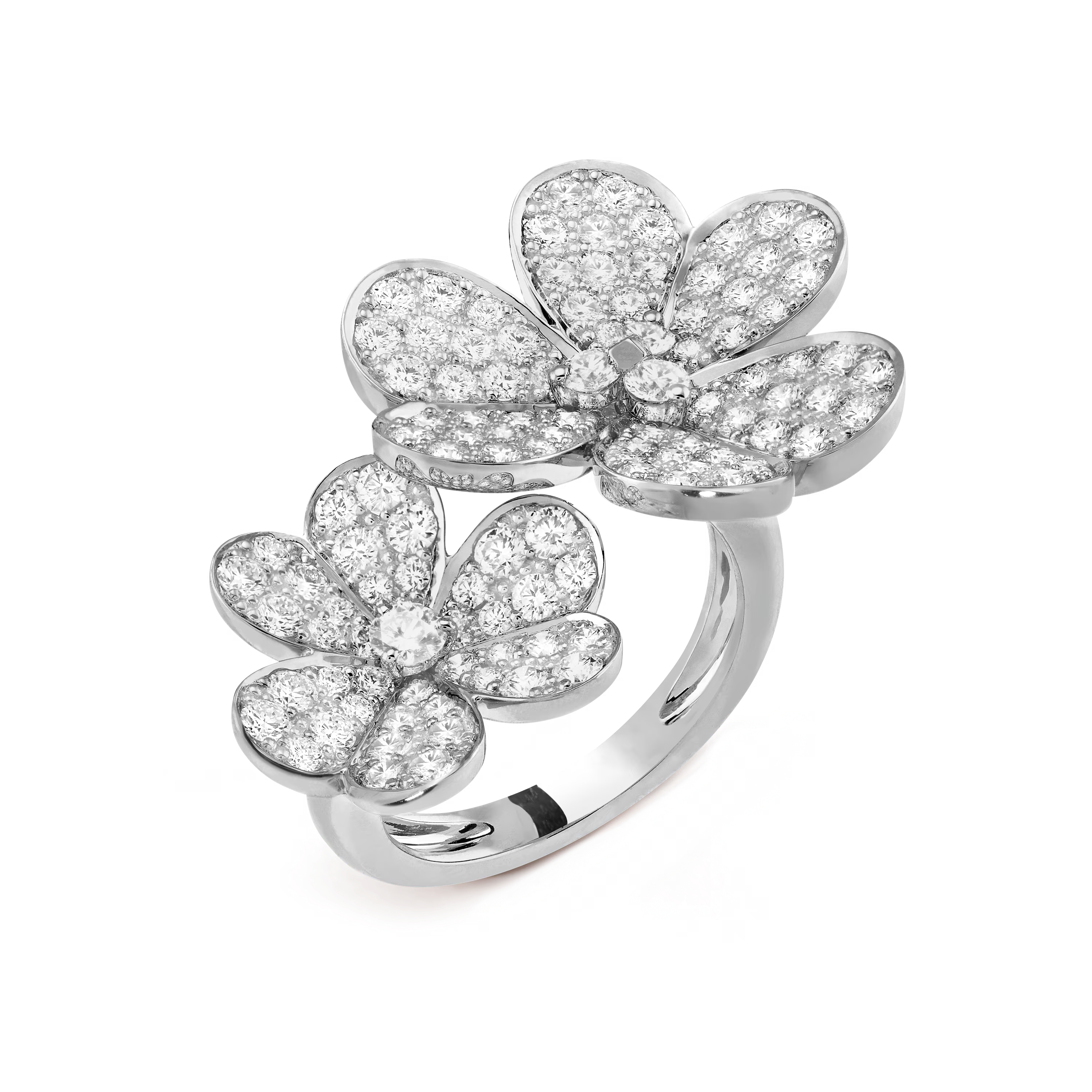 Crafted in 18K white gold, the ring features a beautifully sculpted Frivole flower motif, delicately set with brilliant diamonds at the heart of each petal. The contrast between the soft, polished gold and the sparkling diamonds creates a harmonious balance of light and texture. The between-the-finger design makes this ring a bold statement, yet its refined proportions ensure it remains elegant and wearable.