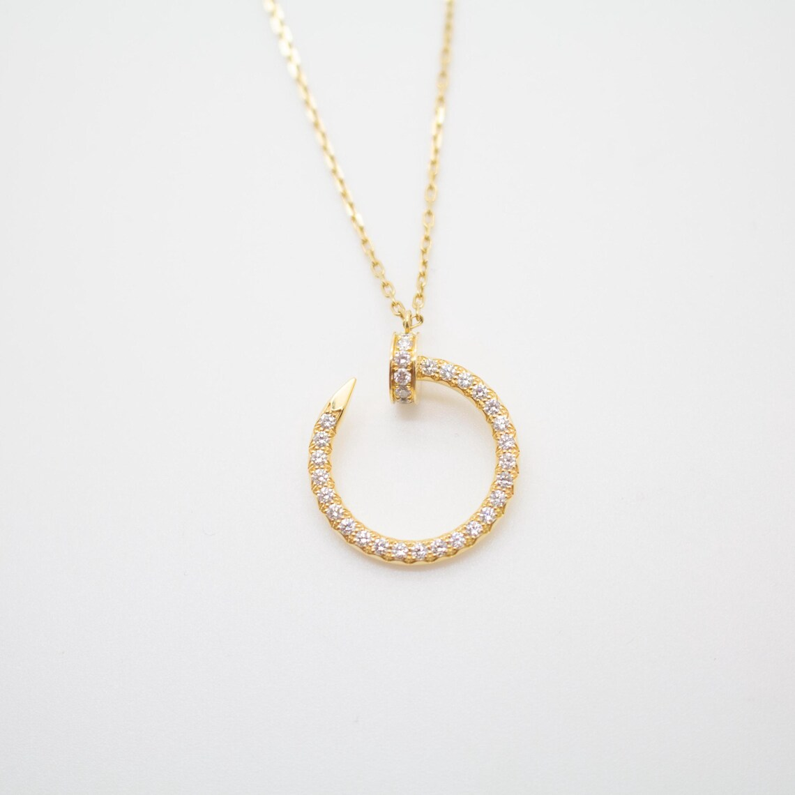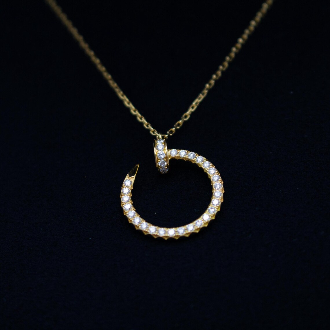 The Juste un Clou pendant transforms the simplicity of a nail into a striking expression of modern elegance. Shaped in gleaming 18K gold, its sleek curve wraps effortlessly into a sculptural loop—a design that feels bold, refined, and unmistakably contemporary.