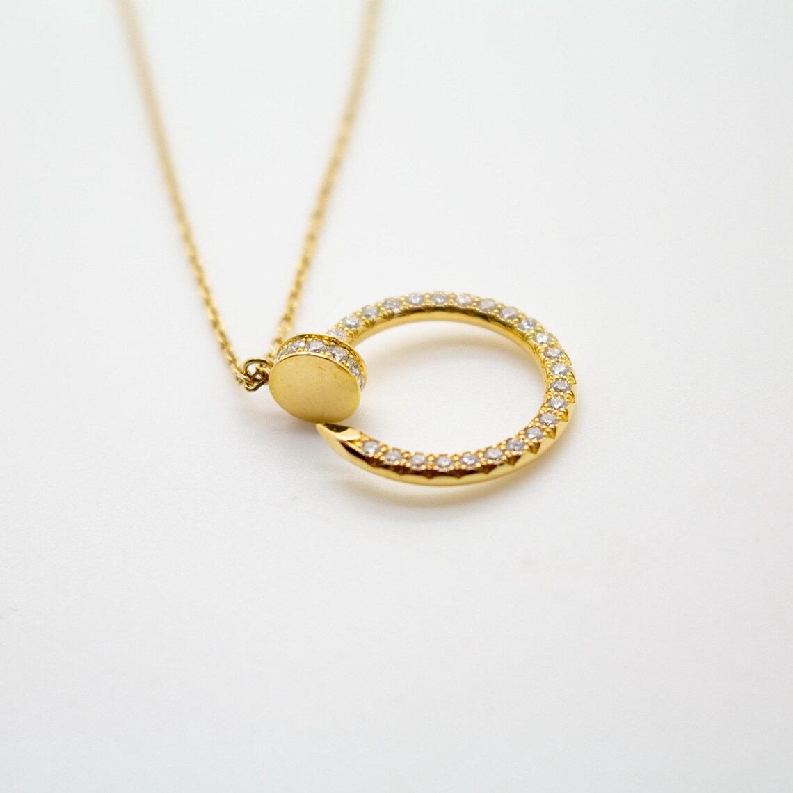 A row of pavé-set brilliant-cut diamonds illuminates the nail’s head, adding a radiant touch that enhances its edgy silhouette. The contrast of minimal form and dazzling sparkle gives this pendant a powerful, confident presence.