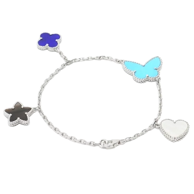 Featuring four different motifs arranged along a delicate chain, the bracelet creates a dynamic and expressive rhythm. Each motif—often rendered in contrasting shapes or materials—adds its own character, forming a poetic composition on the wrist.