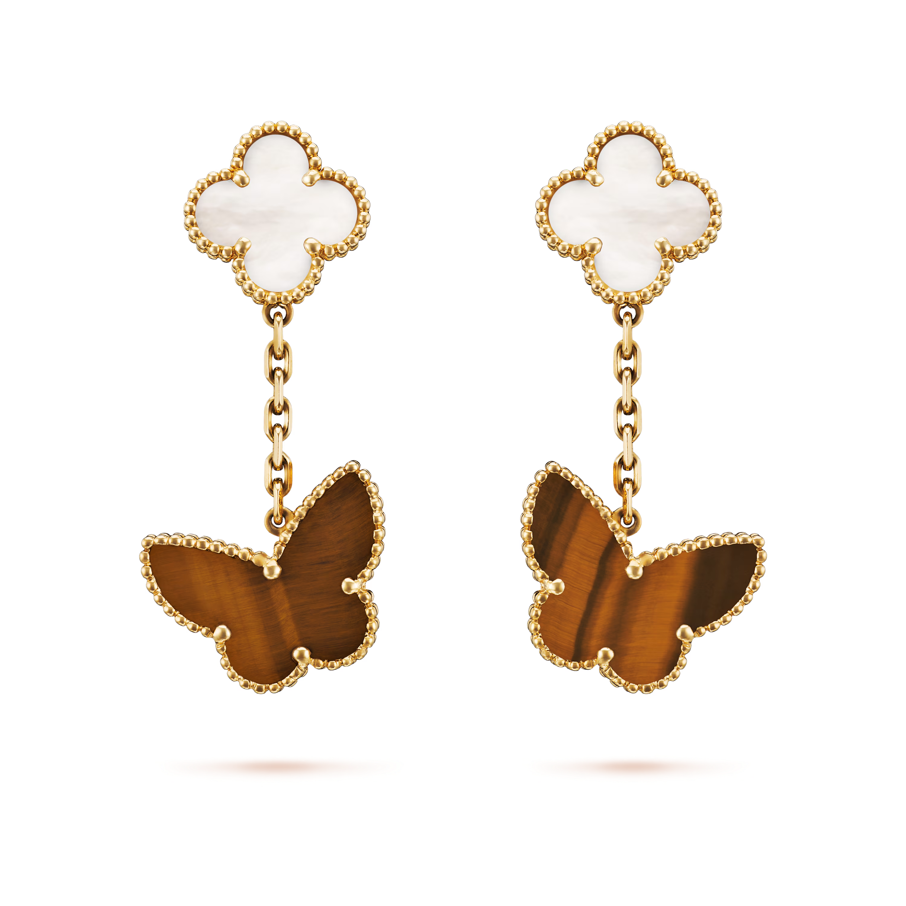 Each earring features two delicately arranged Alhambra motifs, thoughtfully paired to create a balanced, dynamic silhouette. Crafted in radiant 18K yellow gold and framed by Van Cleef & Arpels’ signature beaded border, the motifs are set with a harmonious mix of natural stones — luminous mother-of-pearl and warm, shimmering tiger’s-eye — carefully selected for their unique tones and subtle inner glow.