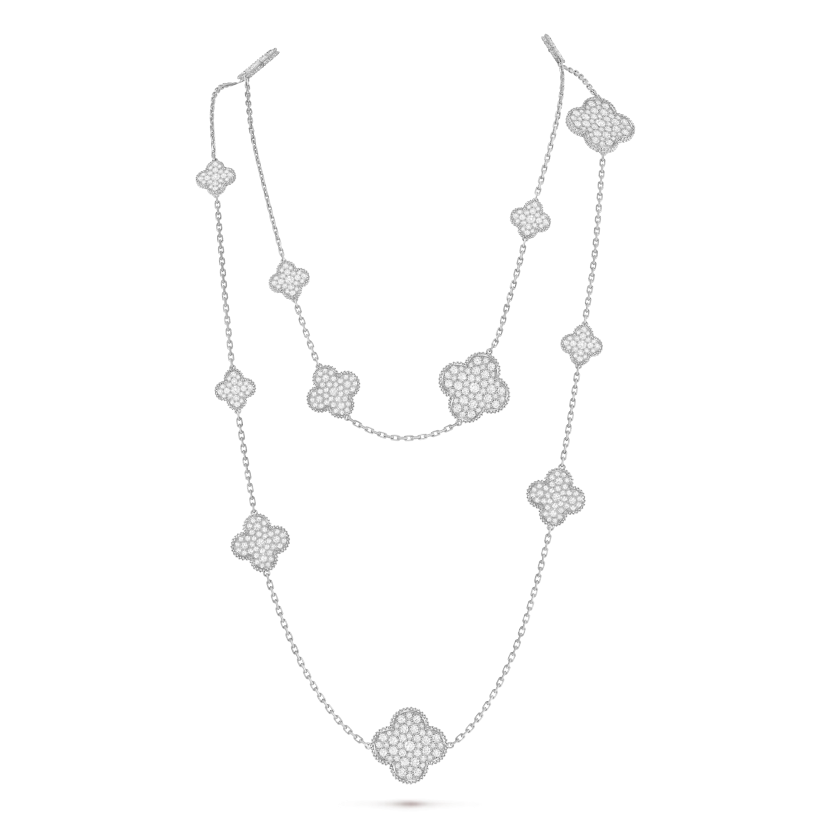 The Magic Alhambra long necklace with 16 motifs combines iconic design, refined craftsmanship, and enduring elegance, making it a timeless addition to any jewelry collection.