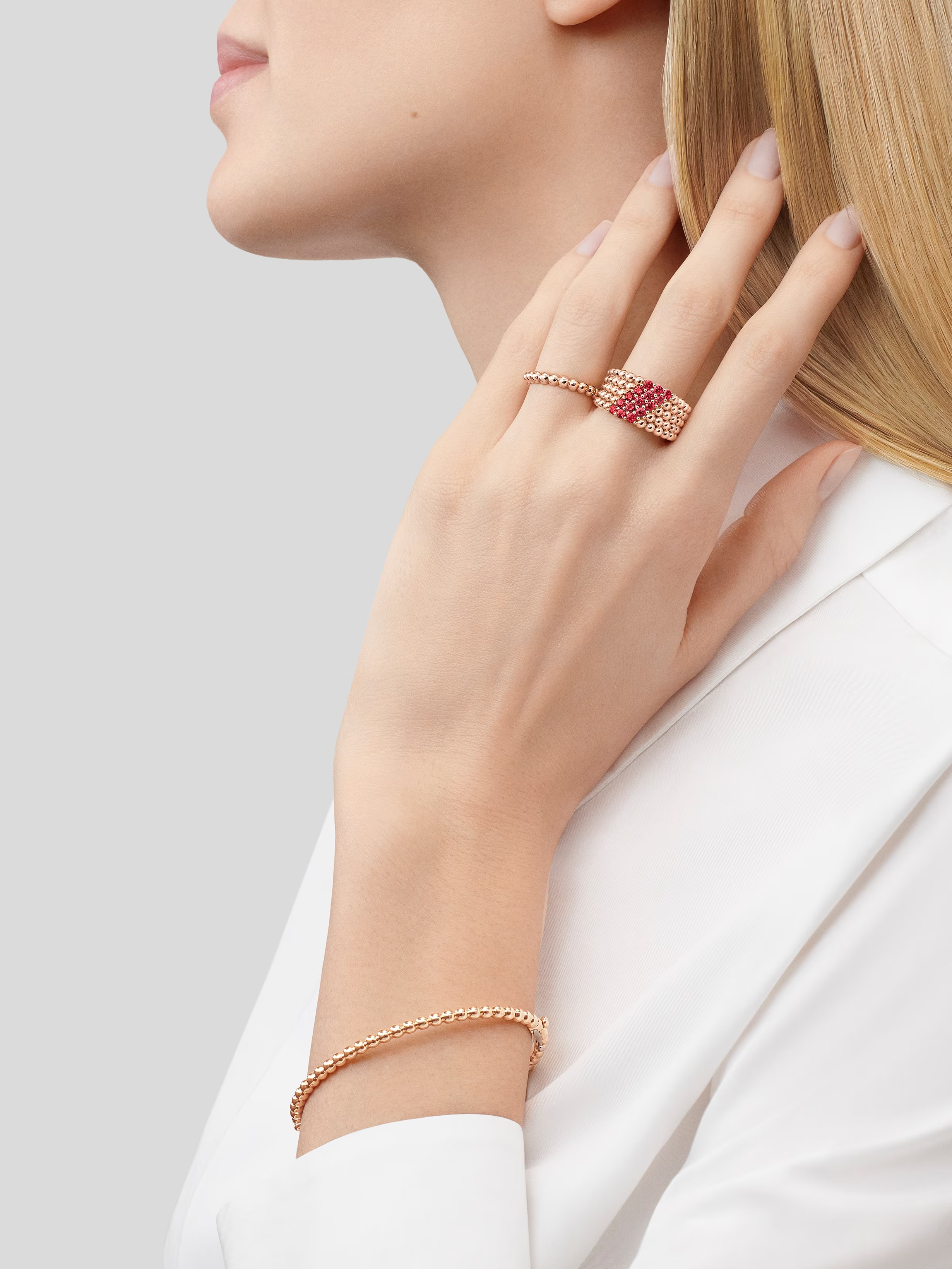 The Perlée pearls of gold bracelet, medium model, celebrates Van Cleef & Arpels’ joyful elegance through its signature beaded design. With a warm, luminous presence, the bracelet highlights the Maison’s ability to transform gold into an expression of softness, movement, and refined beauty.