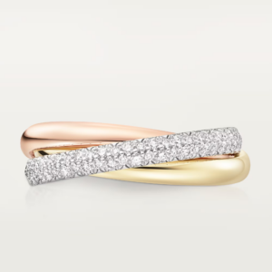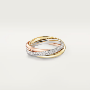 The Cartier Trinity Ring, crafted in exquisite tri‑color 18K gold, is a masterpiece of understated luxury. Each of the three intertwined bands—yellow, white, and rose gold—symbolizes a distinct sentiment: love, fidelity, and friendship.