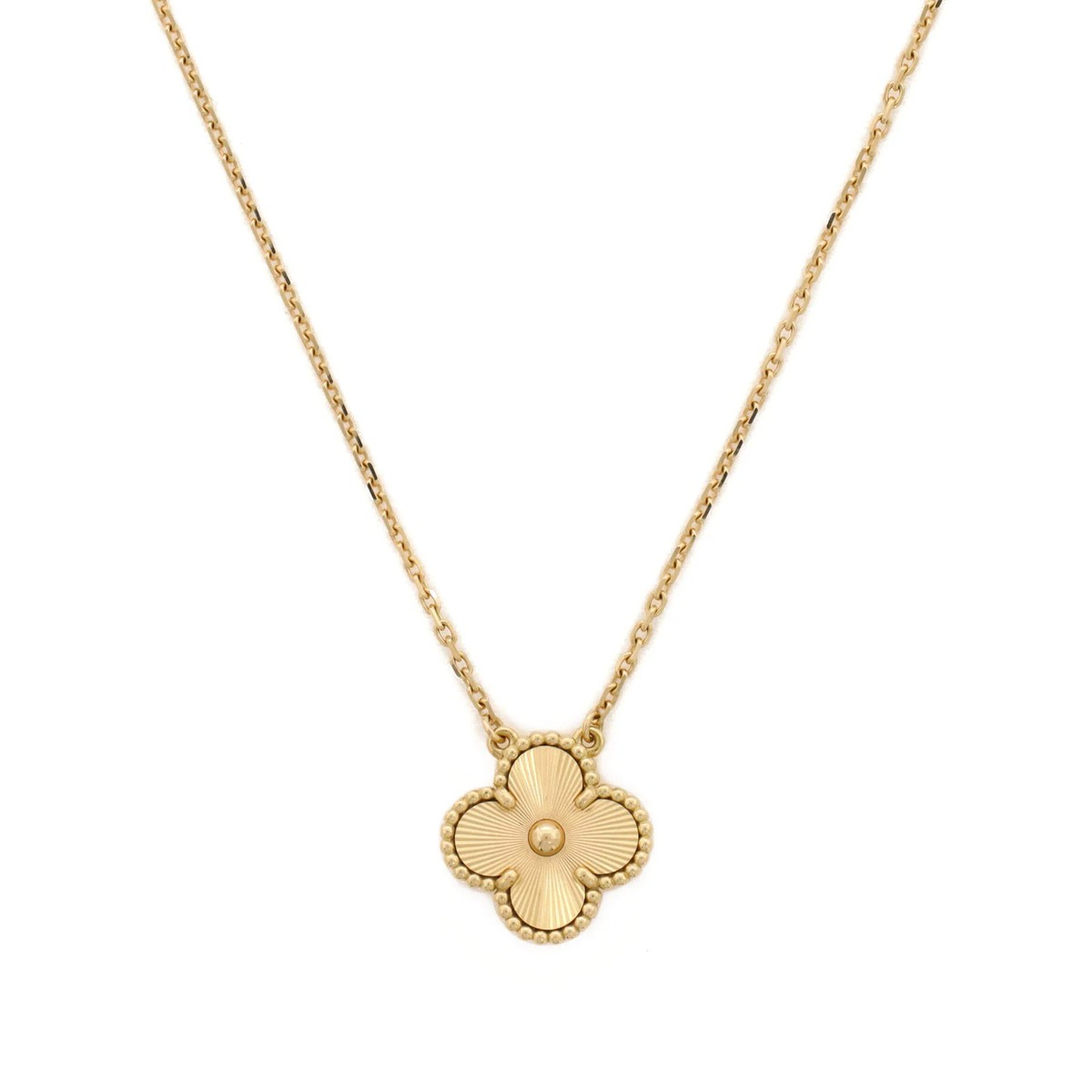 The Vintage Alhambra Pendant Necklace with Guilloché detailing by Van Cleef & Arpels embodies timeless elegance and luxury. Crafted in radiant 18K yellow gold, the pendant features the Maison’s signature Alhambra motif with intricate guilloché engraving, reflecting refined craftsmanship and attention to detail.
