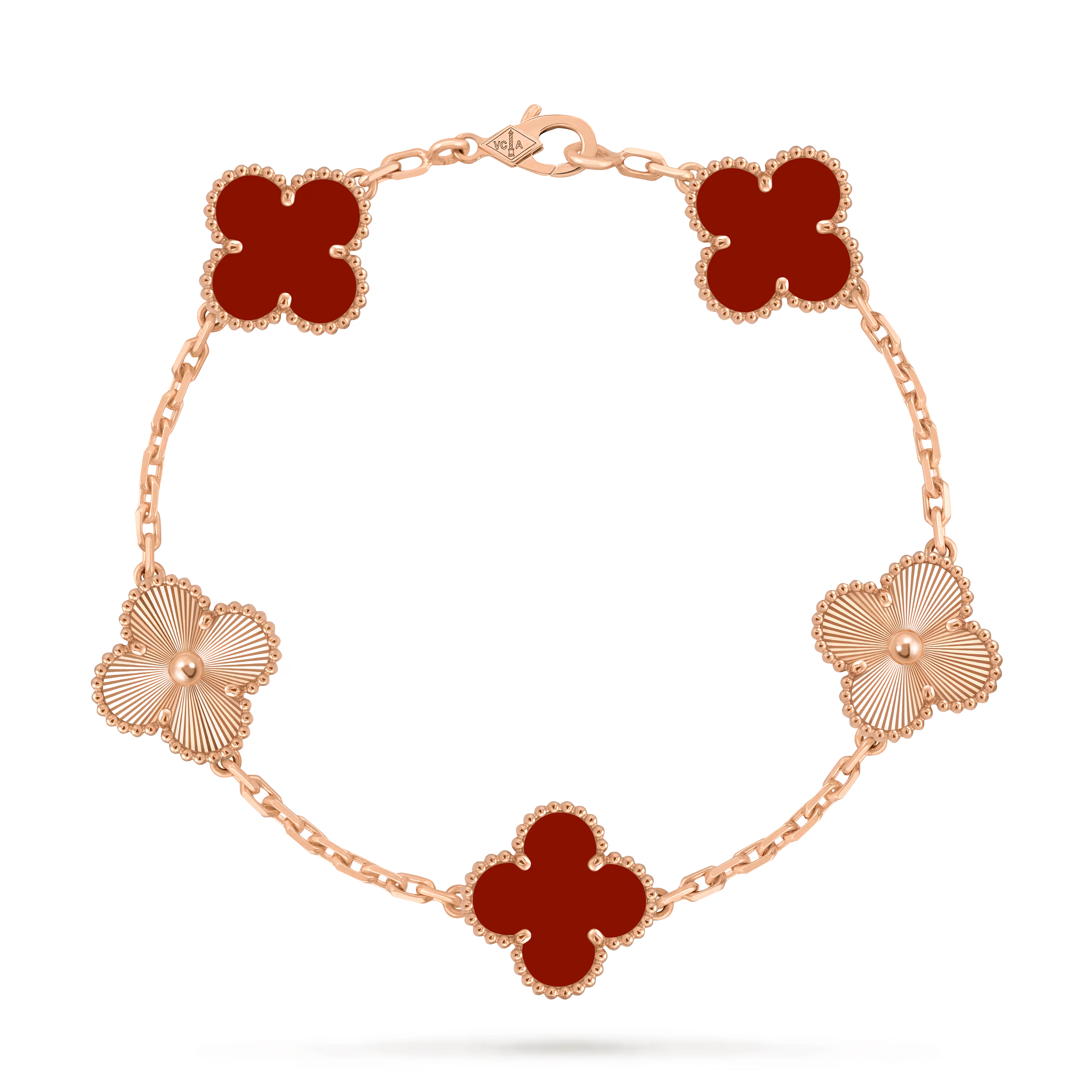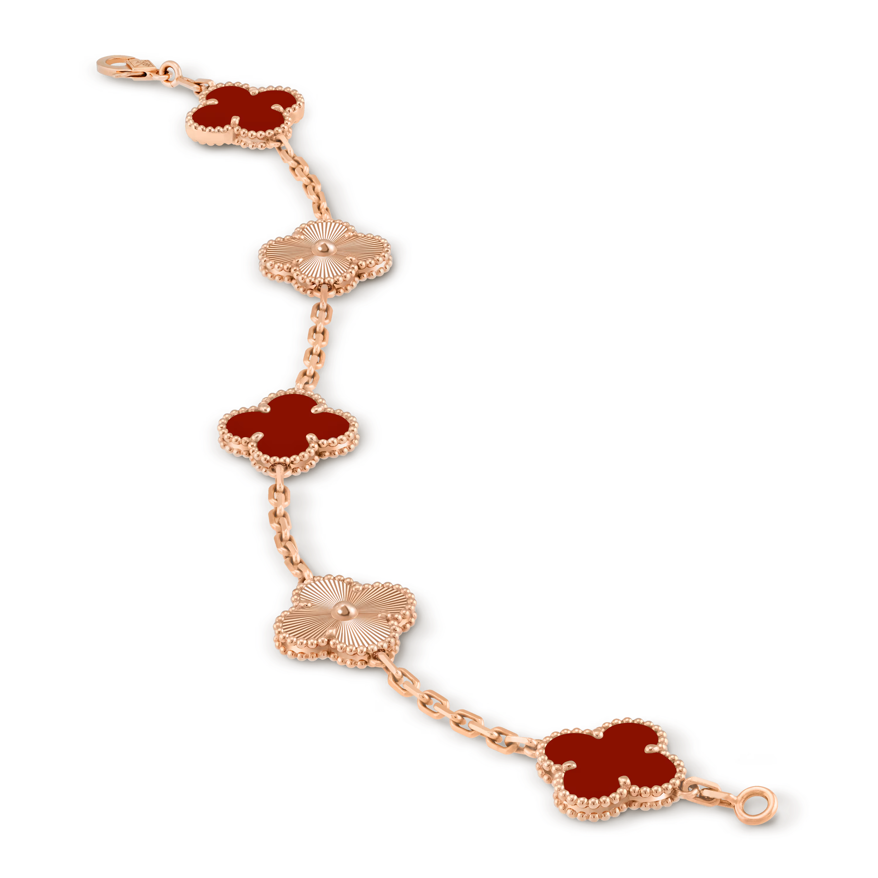 This bracelet features five Vintage Alhambra motifs, evenly aligned along a delicate chain. The symmetrical layout creates a graceful rhythm on the wrist, reflecting classic proportions and balance.