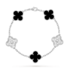 This bracelet showcases five Vintage Alhambra motifs arranged with perfect symmetry along the chain. The balanced spacing creates a refined rhythm on the wrist, highlighting classic proportions and enduring sophistication.