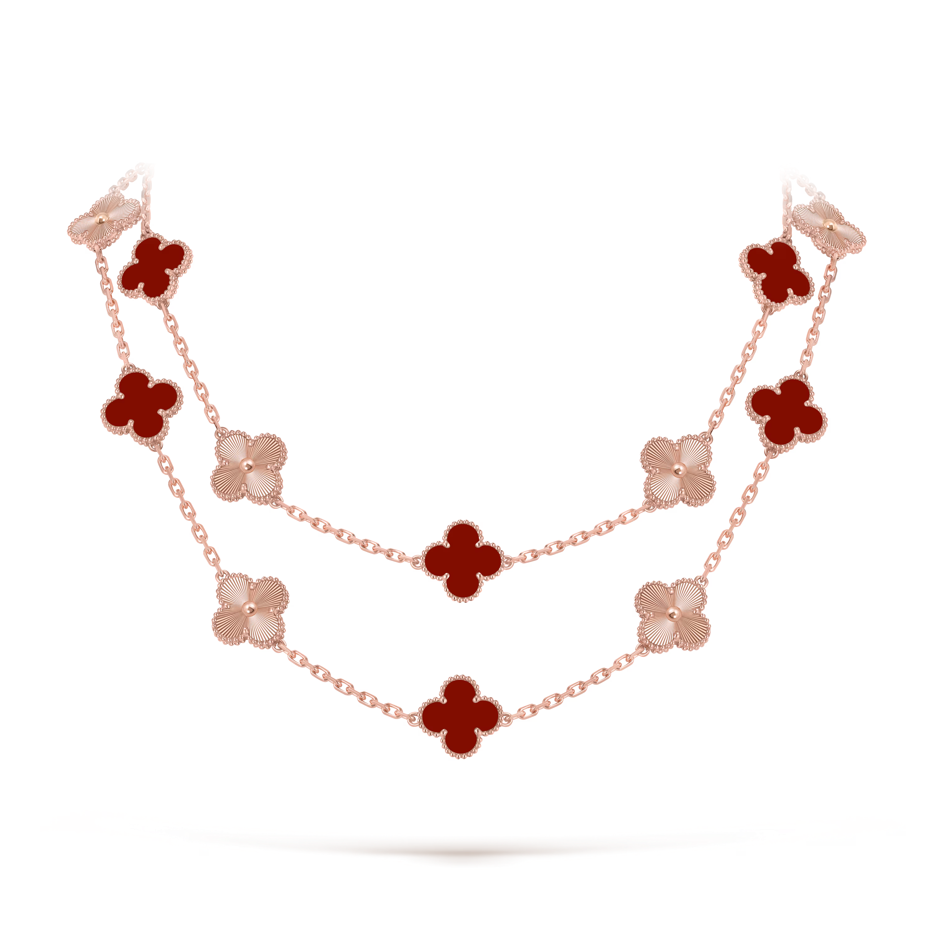 Inspired by the universal symbol of good fortune, the Vintage Alhambra collection was first introduced in 1968. The long necklace reimagines this emblem through repeated motifs, offering a graceful rhythm and a refined balance that has become synonymous with the collection’s enduring charm.