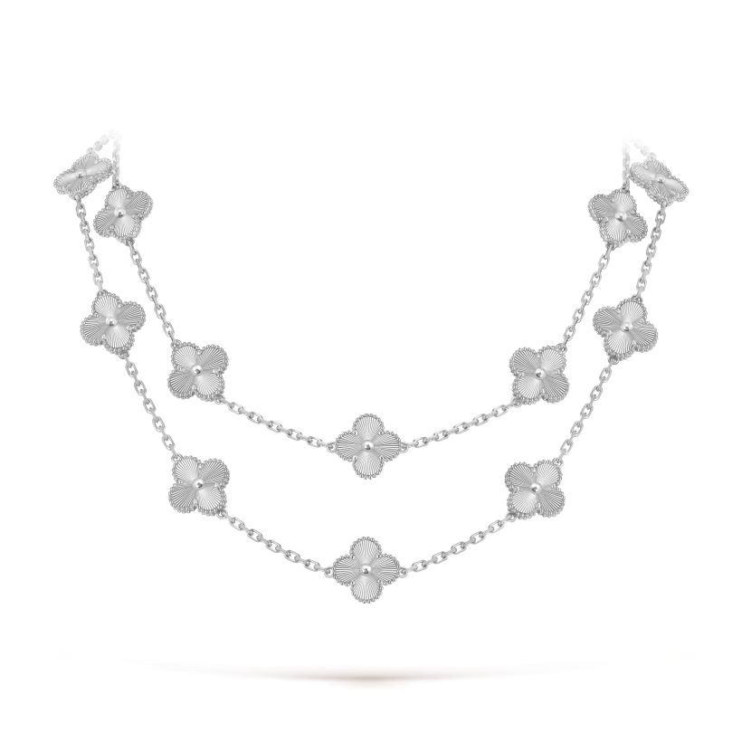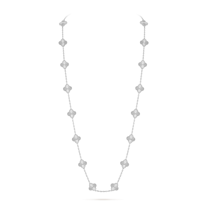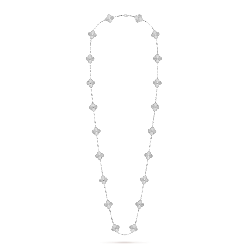 The Vintage Alhambra long necklace features twenty signature four-leaf clover motifs crafted from natural materials with delicate beaded 18K gold edges. This iconic design symbolizes luck, elegance, and timeless beauty.