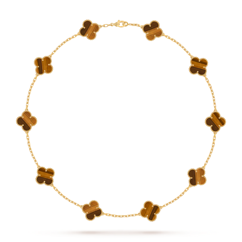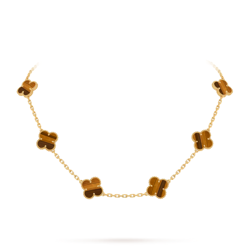 The Vintage Alhambra necklace features ten signature four-leaf clover motifs crafted from natural materials and framed by delicate 18K gold beaded edges. This iconic design represents luck, elegance, and timeless craftsmanship.