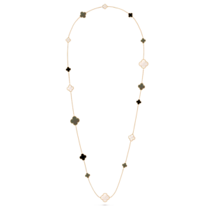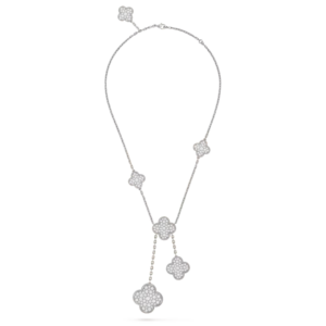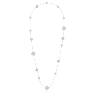 Suspended from a matching white gold chain, the pendant sits elegantly along the neckline, offering a touch of quiet luxury. Whether worn alone or paired with other Alhambra creations, it remains a graceful symbol of harmony and timeless beauty.