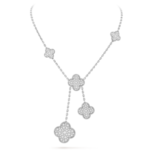 Suspended from a matching white gold chain, the pendant sits elegantly along the neckline, offering a touch of quiet luxury. Whether worn alone or paired with other Alhambra creations, it remains a graceful symbol of harmony and timeless beauty.