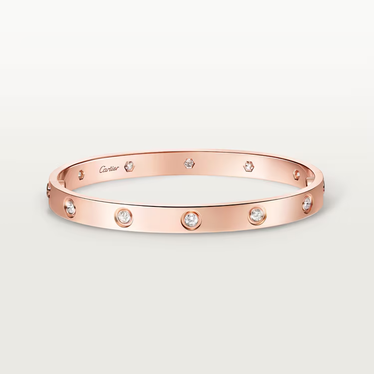 The Cartier LOVE bracelet, classic model, is an enduring emblem of eternal love. Defined by the signature screw motif, the design symbolizes a bond meant to last forever, enhanced with 10 diamonds for subtle brilliance and sophistication.