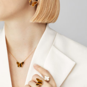 The Van Cleef & Arpels Lucky Alhambra Butterfly Pendant Necklace features the iconic Alhambra motif combined with a delicate butterfly design, symbolizing luck, elegance, and transformation. Crafted in 18K gold, this pendant reflects exceptional craftsmanship and timeless sophistication.