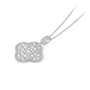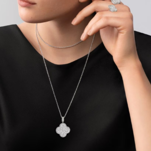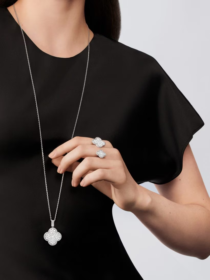 The Magic Alhambra long necklace features a single, oversized clover motif that embodies luck, harmony, and timeless elegance. This expressive design highlights Van Cleef & Arpels’ signature blend of poetic beauty and refined craftsmanship, offering a modern take on a classic icon.