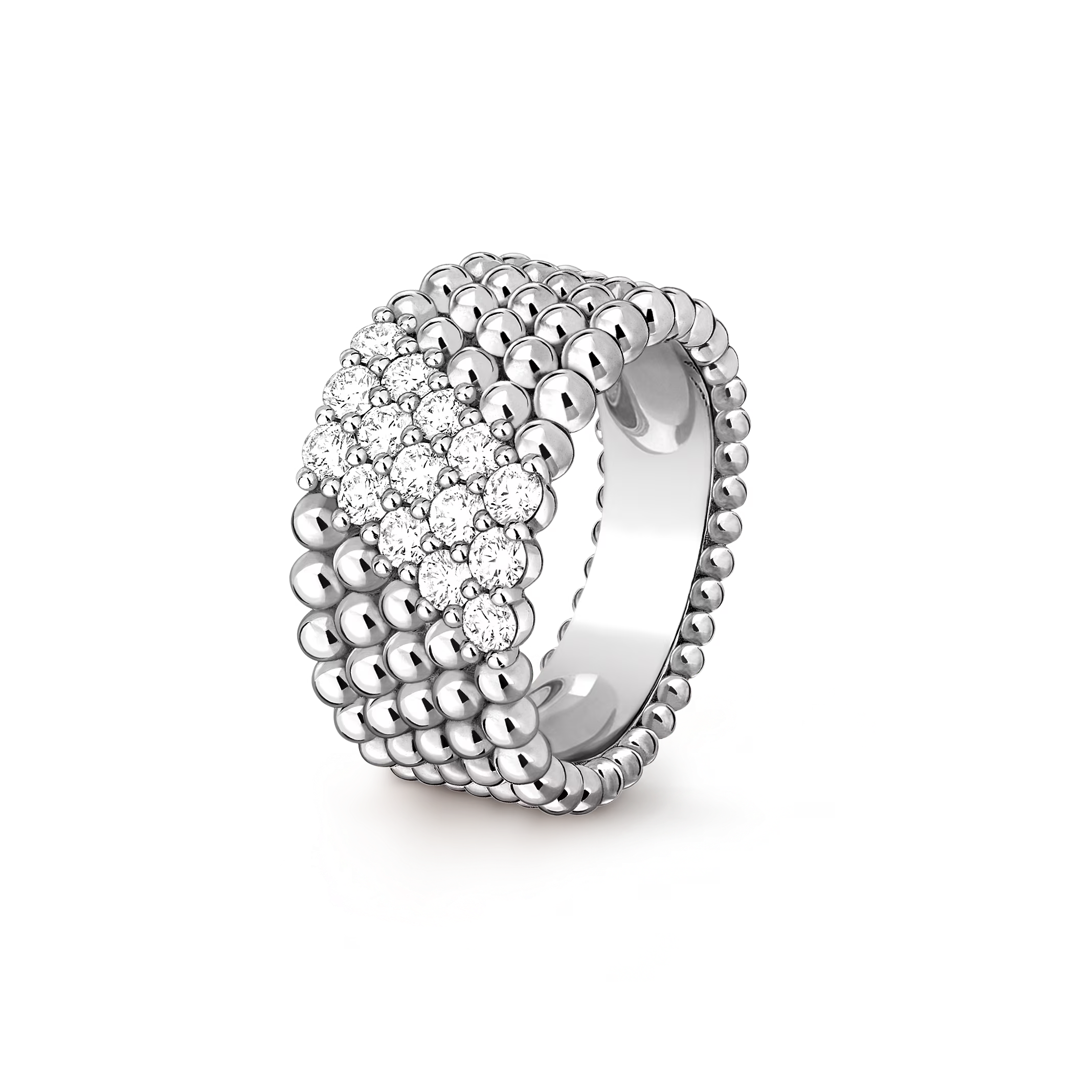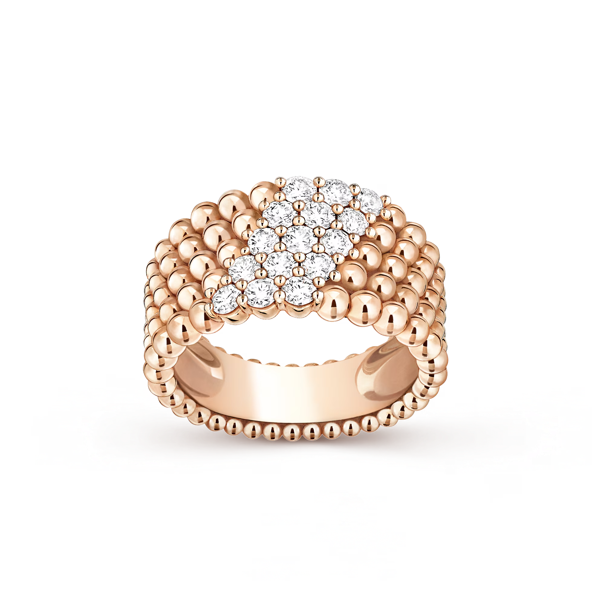 A radiant celebration of craftsmanship and light, the Perlée Diamonds Ring, 5 Rows showcases the Maison’s iconic golden beads in their most opulent expression. This exceptional creation highlights Van Cleef & Arpels’ mastery of texture, brilliance, and harmonious design.