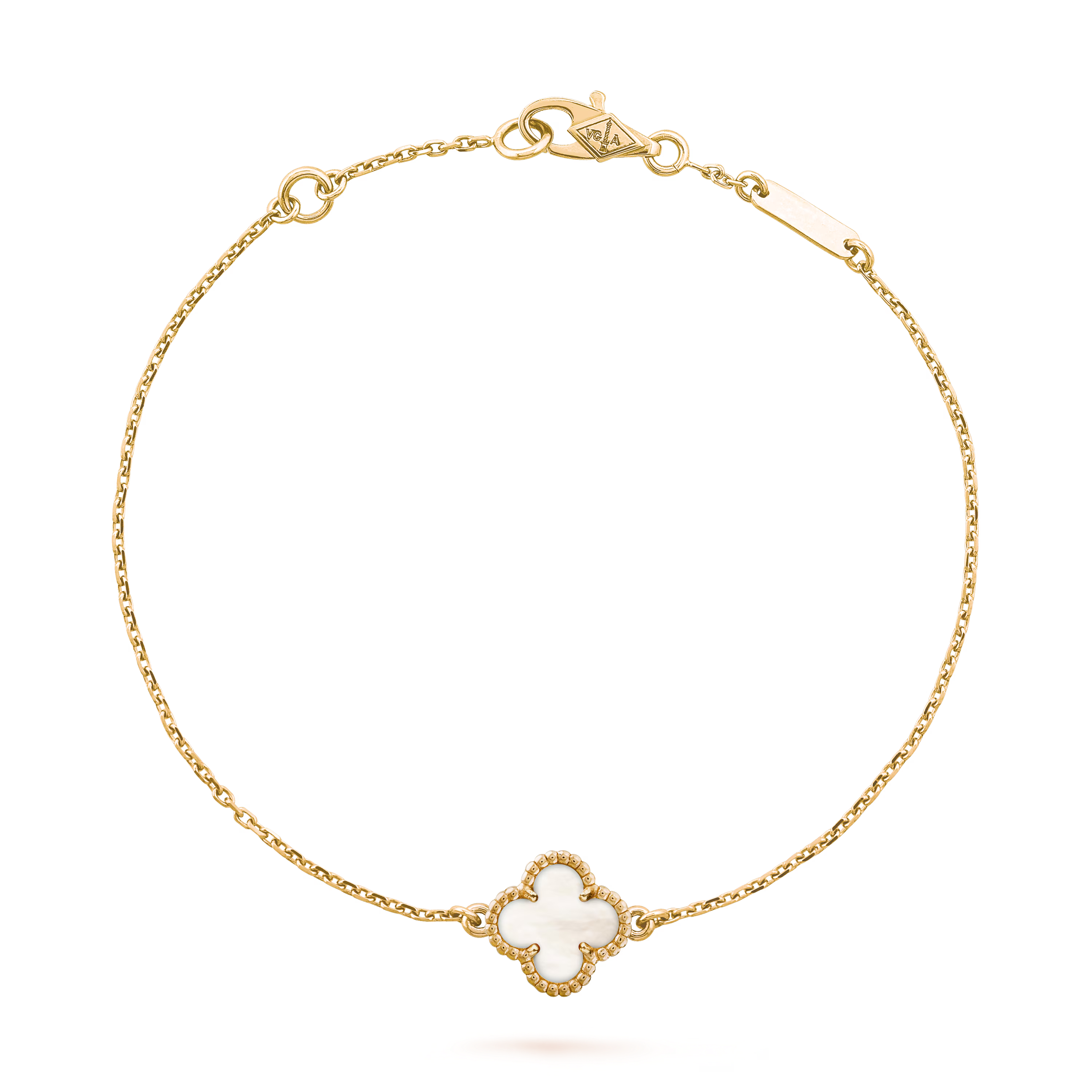 Lightweight and elegant, the Sweet Alhambra bracelet rests comfortably on the wrist. It may be worn alone for a delicate statement or layered with other Alhambra creations to express a personalized style.