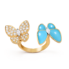 One butterfly is adorned with vivid turquoise, its striking blue tone recalling clear skies and serene horizons. Smooth and radiant, the stone’s natural beauty offers a joyful contrast to the warm gold. The second butterfly shimmers with brilliant diamonds, carefully set to trace its delicate wings and capture the light with every gesture.