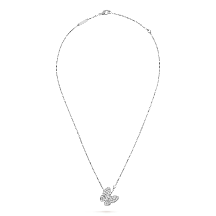 The Van Cleef & Arpels Two Butterfly Pendant Necklace features two delicately crafted butterfly motifs, symbolizing grace, transformation, and freedom. Crafted in 18K gold, the design reflects the Maison’s signature craftsmanship and timeless elegance.