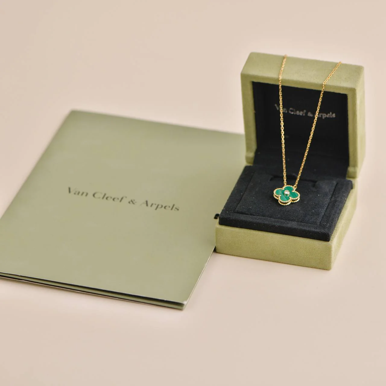 This Van Cleef & Arpels Vintage Alhambra Diamond Malachite Pendant Necklace showcases the Maison’s iconic four-leaf clover motif, symbolizing luck and timeless elegance. The pendant features rich green malachite, known for its natural banding, paired with a brilliant diamond at the center. Surrounded by the collection’s signature beaded gold border, the pendant is refined, vibrant, and instantly recognizable.