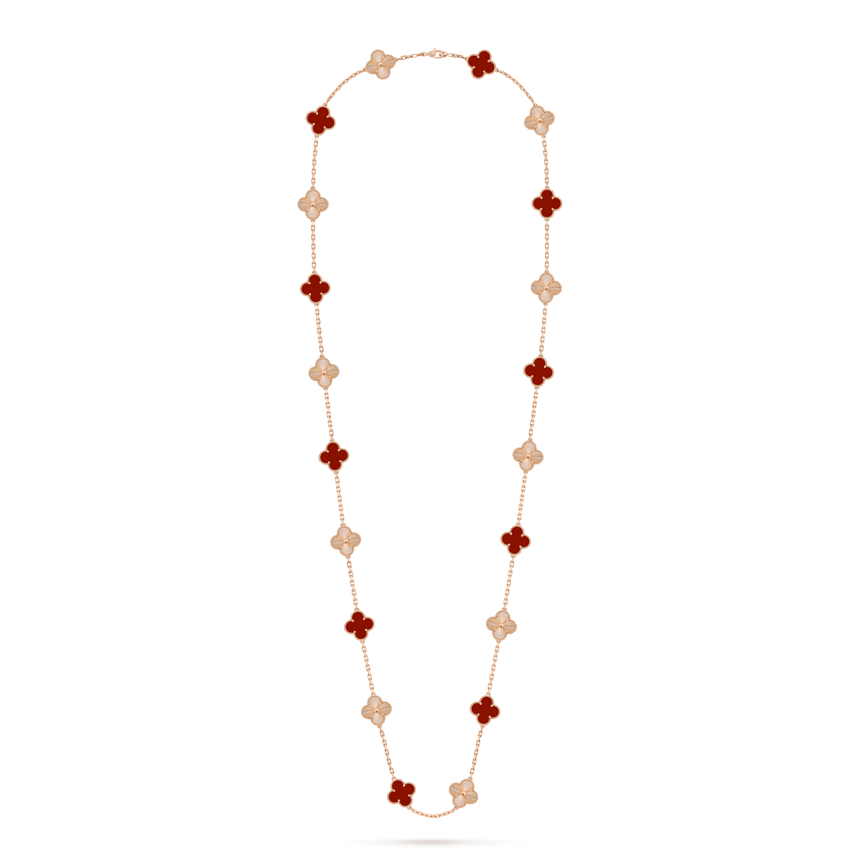 Inspired by the universal symbol of good fortune, the Vintage Alhambra collection was first introduced in 1968. The long necklace reimagines this emblem through repeated motifs, offering a graceful rhythm and a refined balance that has become synonymous with the collection’s enduring charm.