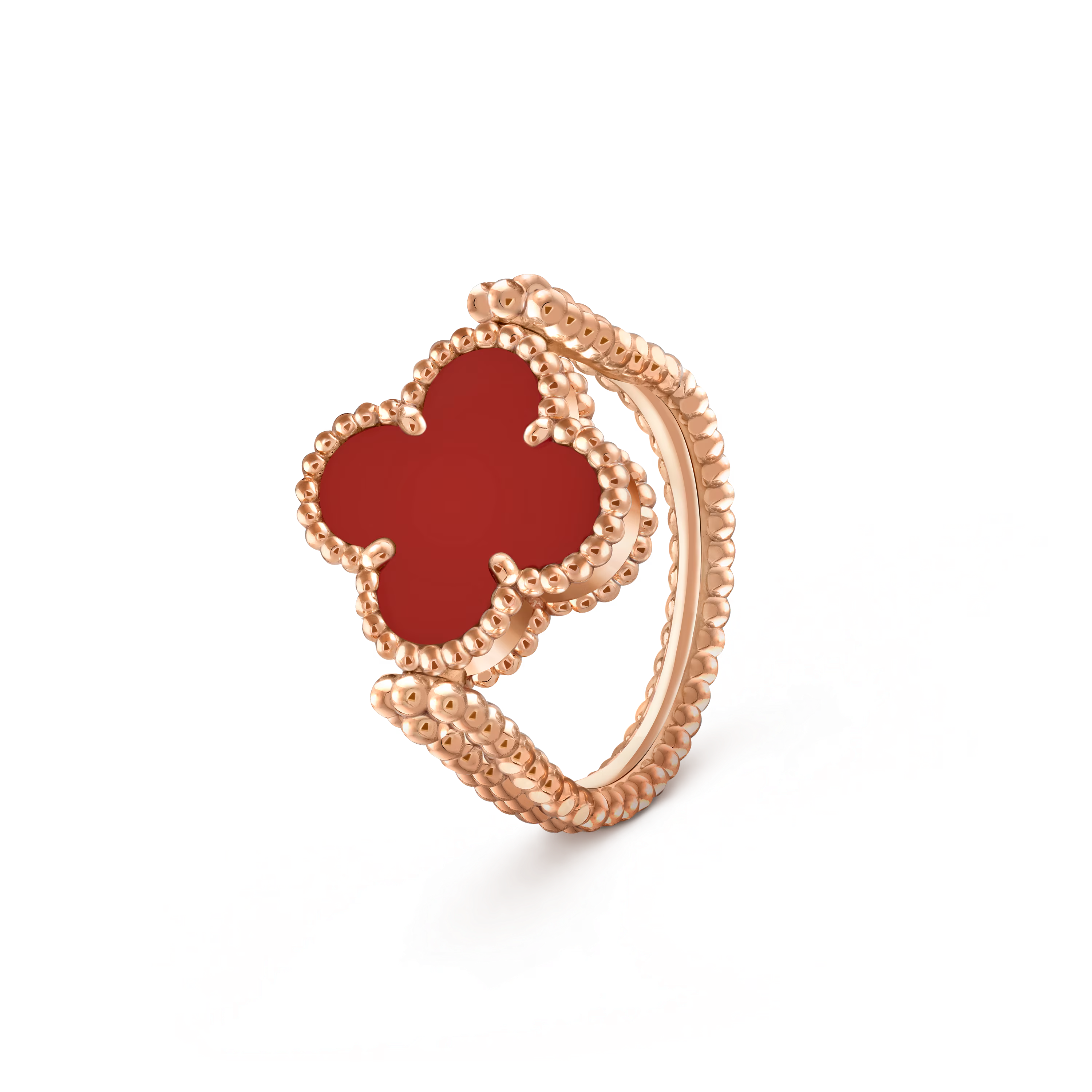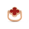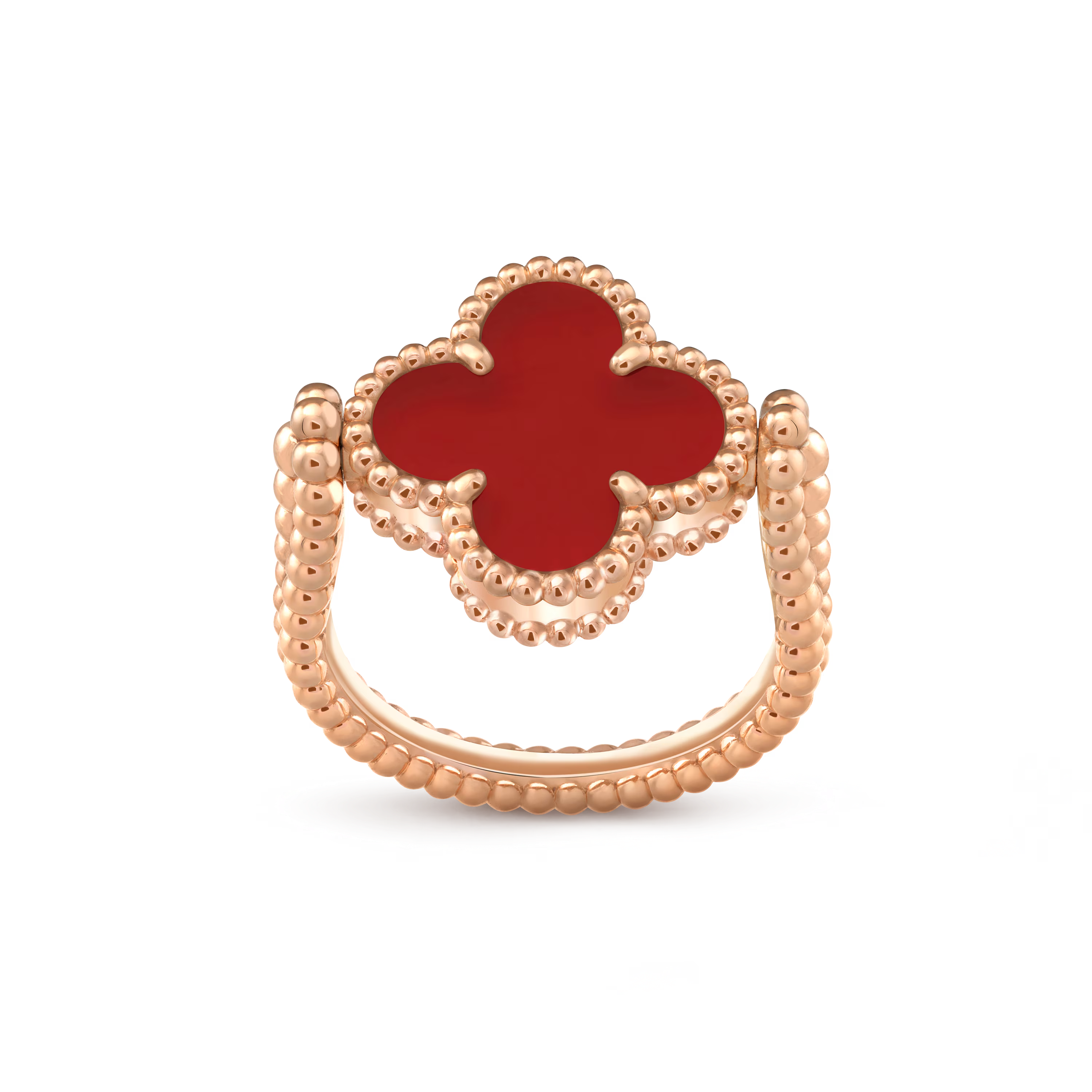 On one side, a radiant carnelian motif reveals its warm, velvety hue, symbolizing vitality and joy. Flip the design, and the ring transforms into a luminous treasure adorned with a brilliant diamond, offering a refined sparkle that captures light with every gesture. Both motifs are framed by the signature golden beaded contour, a hallmark of Van Cleef & Arpels’ craftsmanship.